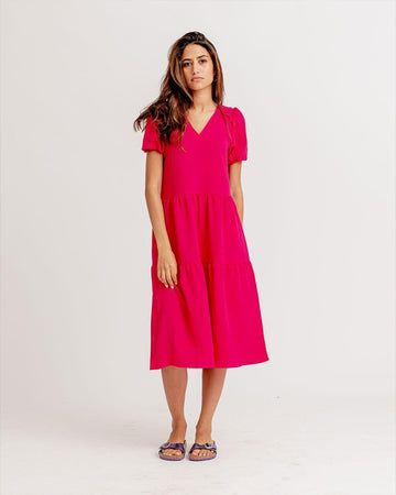This dress features multiple tiers that create a flowingly elegant silhouette. Its midi length and the V-shaped neckline add a touch of elegance to the overall look, making it suitable for any occasion.