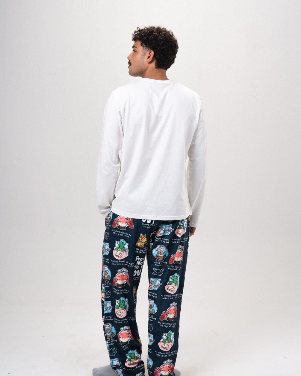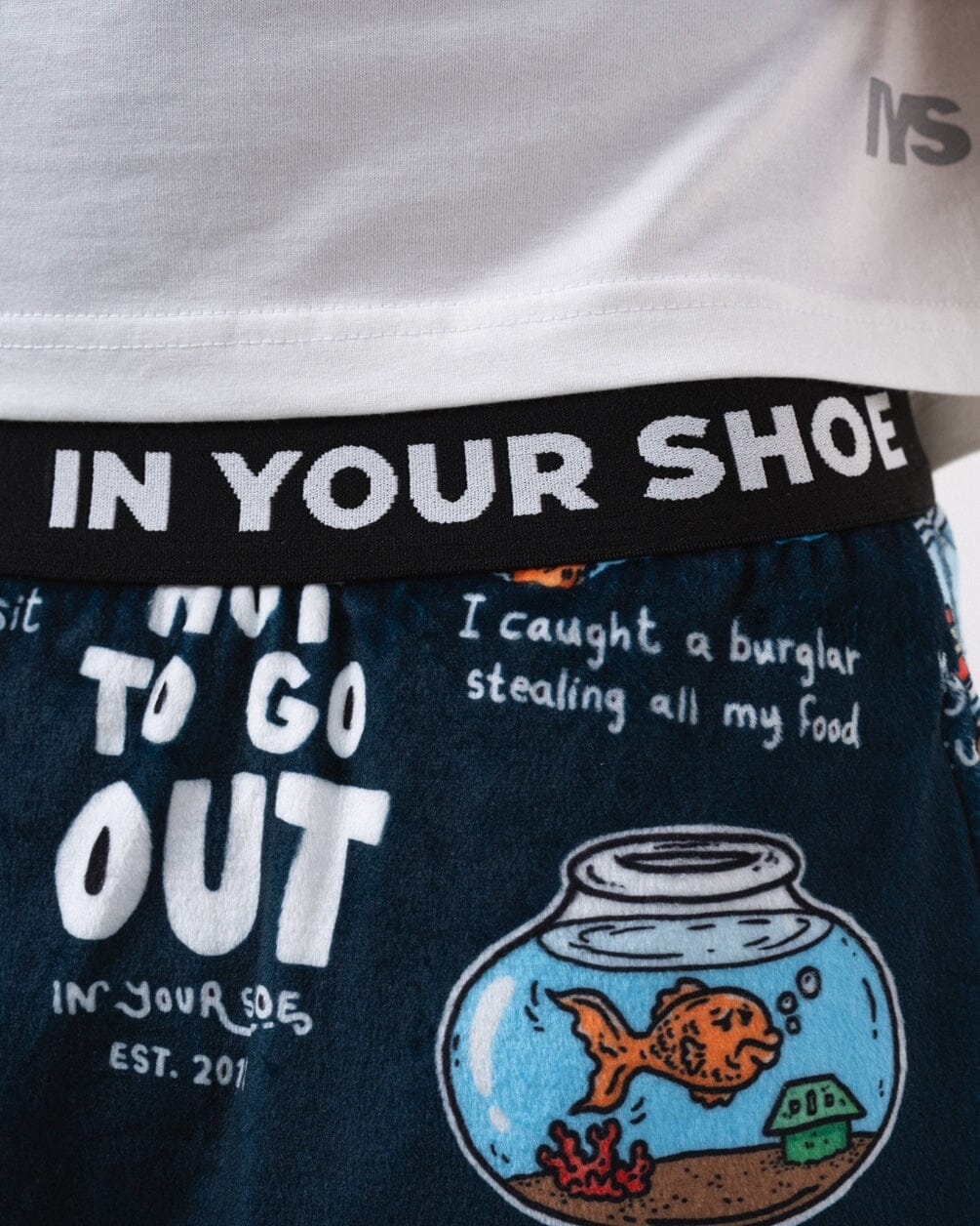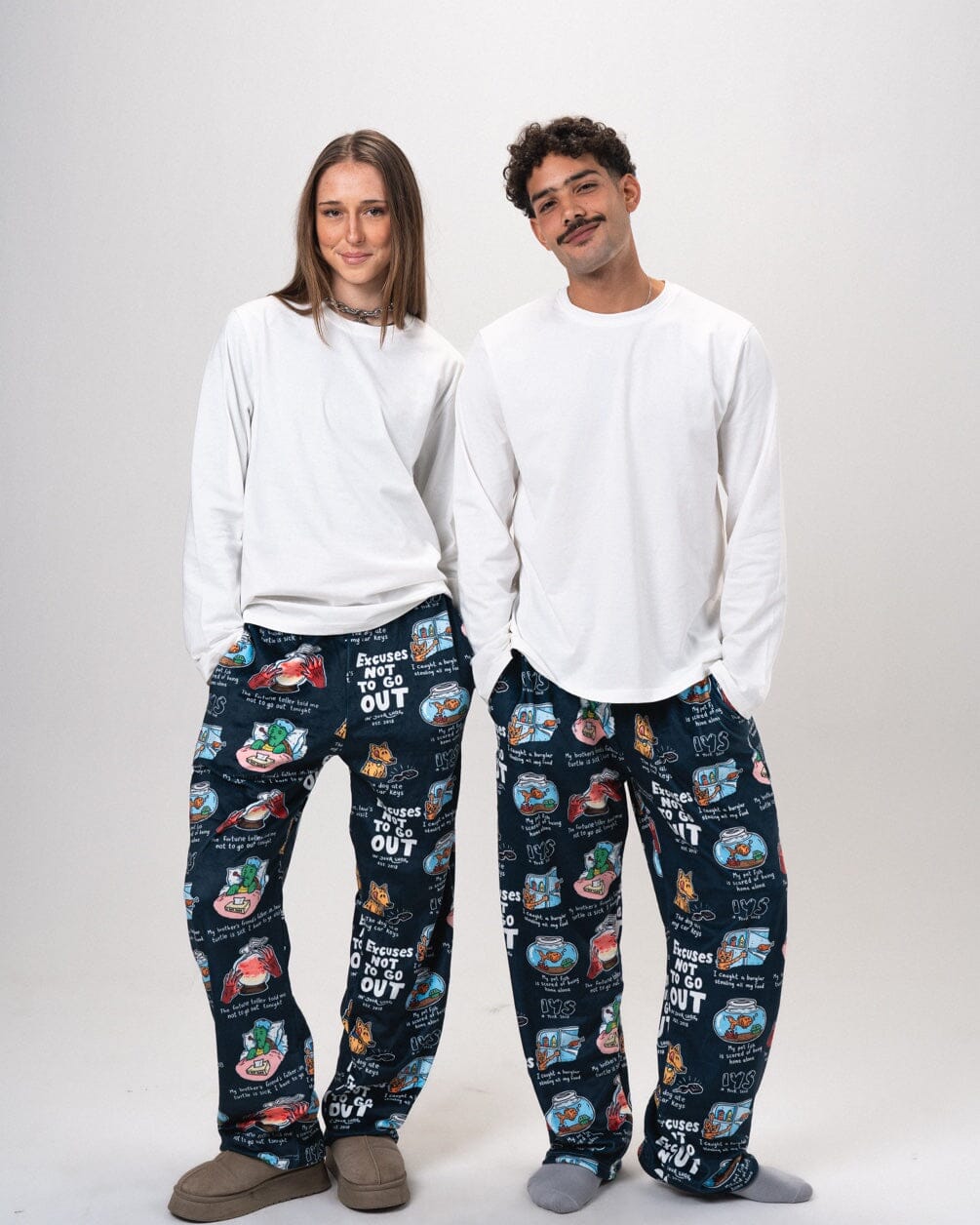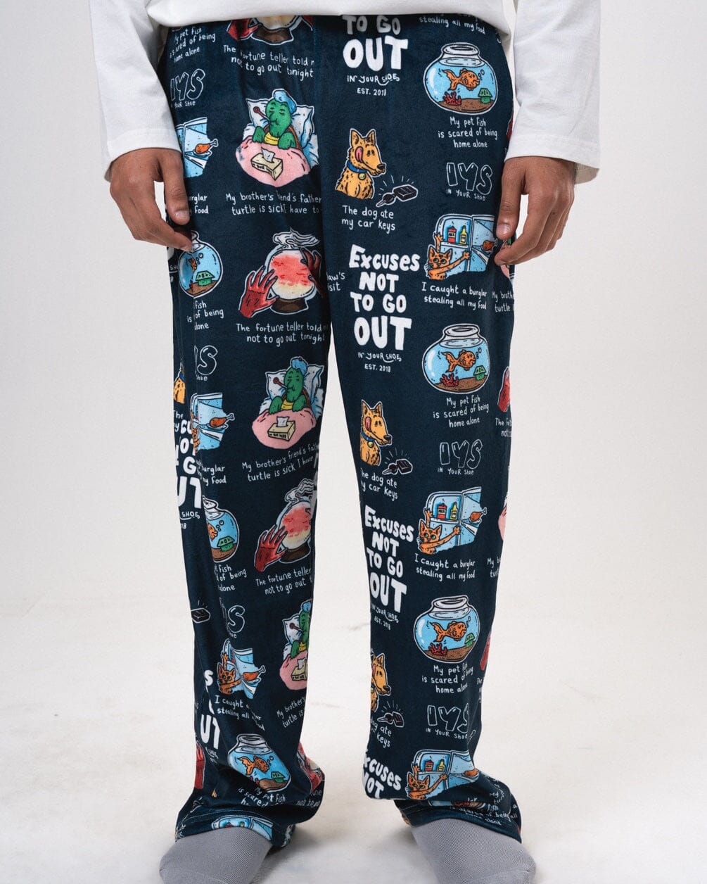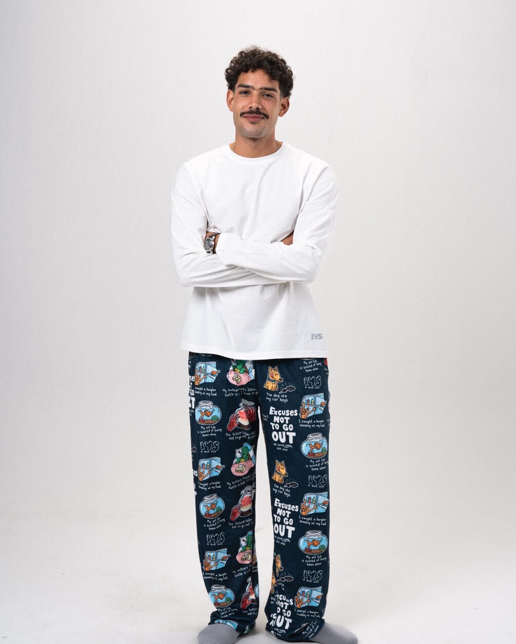 DON’T GO OUT! Stay in you navy blue and white fluffy pjoy. Our terminology for pyjama pants that are super joyful, just like you reading this.