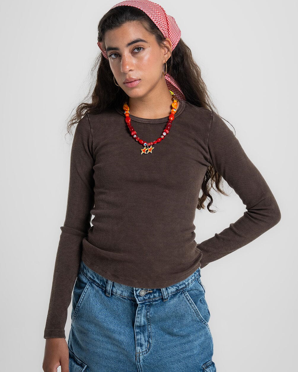 Soft, ribbed long sleeve top in a fitted cut. Features a washed brown tone and classic crew neckline, easy to style, comfy to wear.