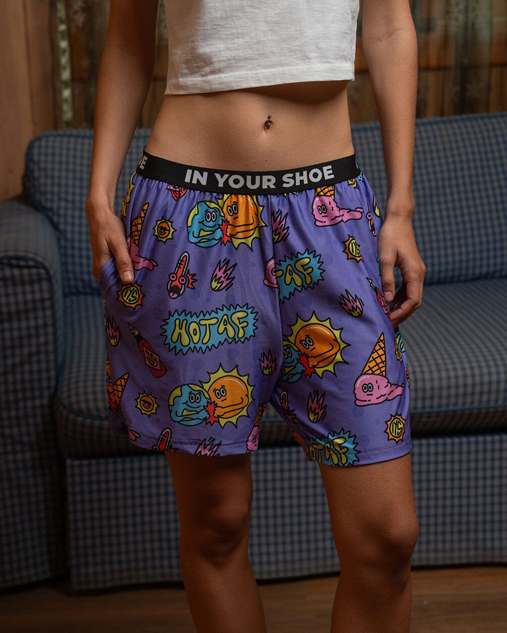 Pyjama shorts for whoever's wearing 'em—you're hot AF. Smokin' style, zero try—turn heads from the couch.