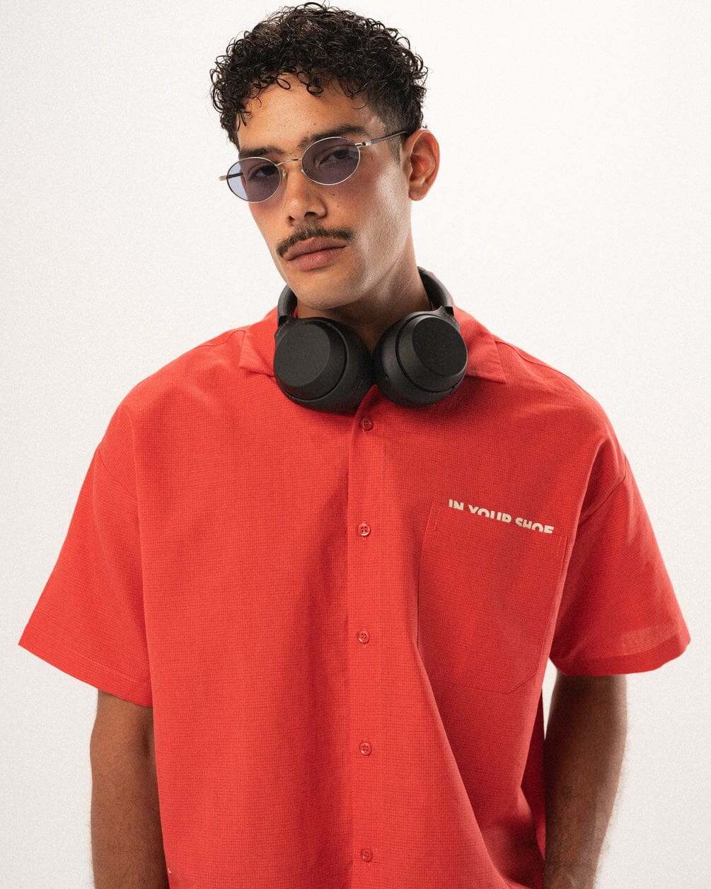 Boxy linen shirt in a red grid pattern, designed with a relaxed, structured fit. Lightweight and breathable, it features a straight silhouette with a slightly oversized cut for easy everyday wear.