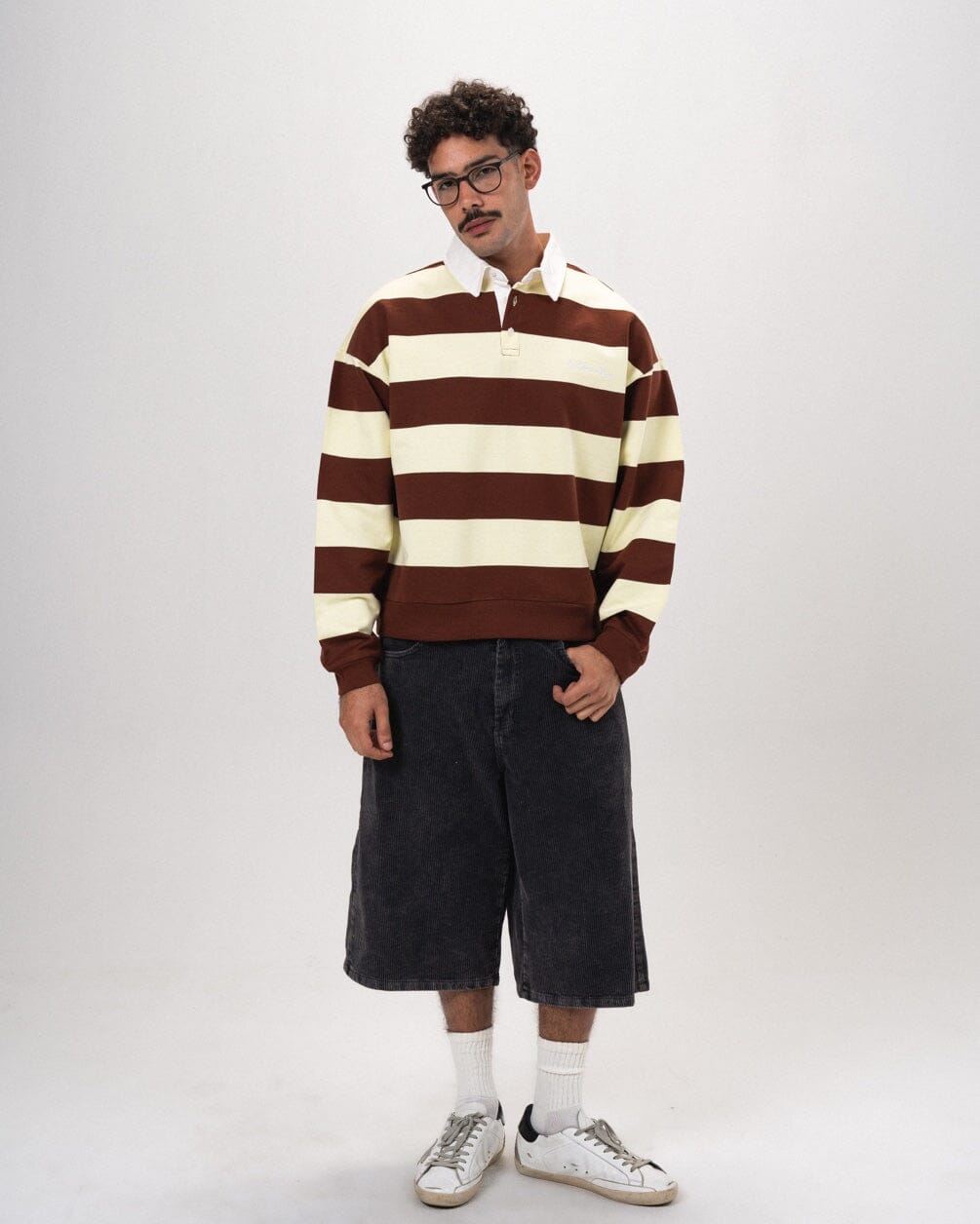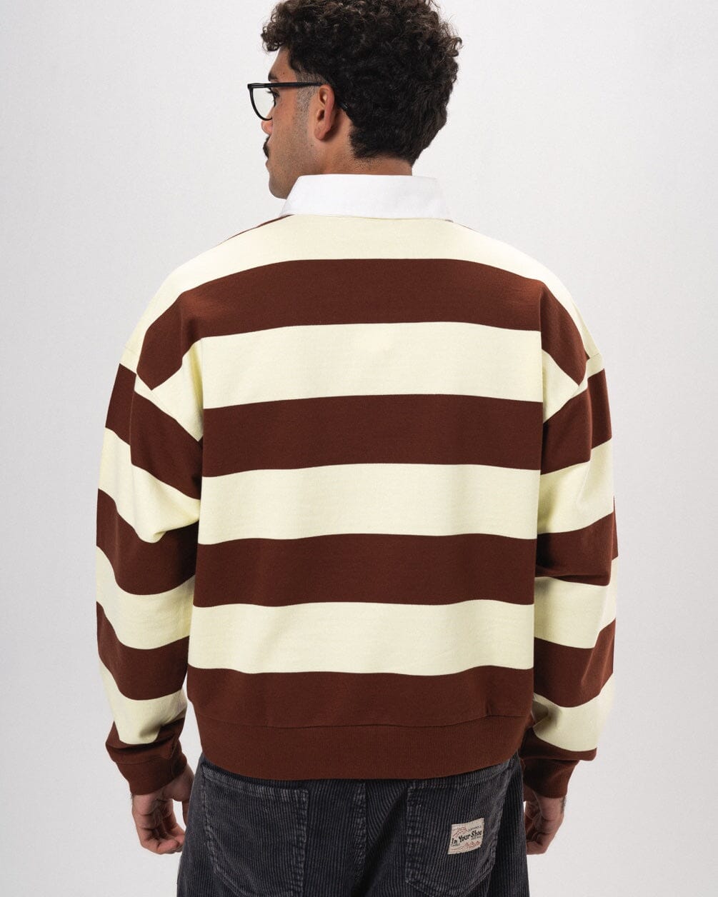 Cream and brown stripes on a boxy rugby for warm, coffee‑coded energy. Relaxed, soft, and perfect for “I just threw this on” mornings.