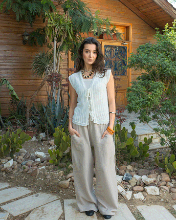 A lightweight, sleeveless vest with delicate knit details and front tie closures—perfect for easy layering