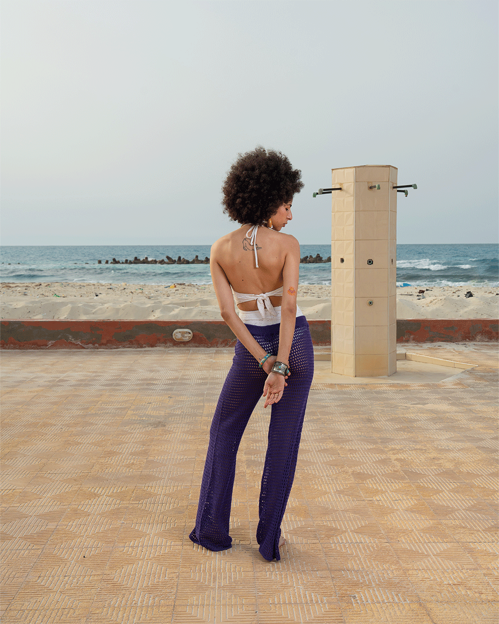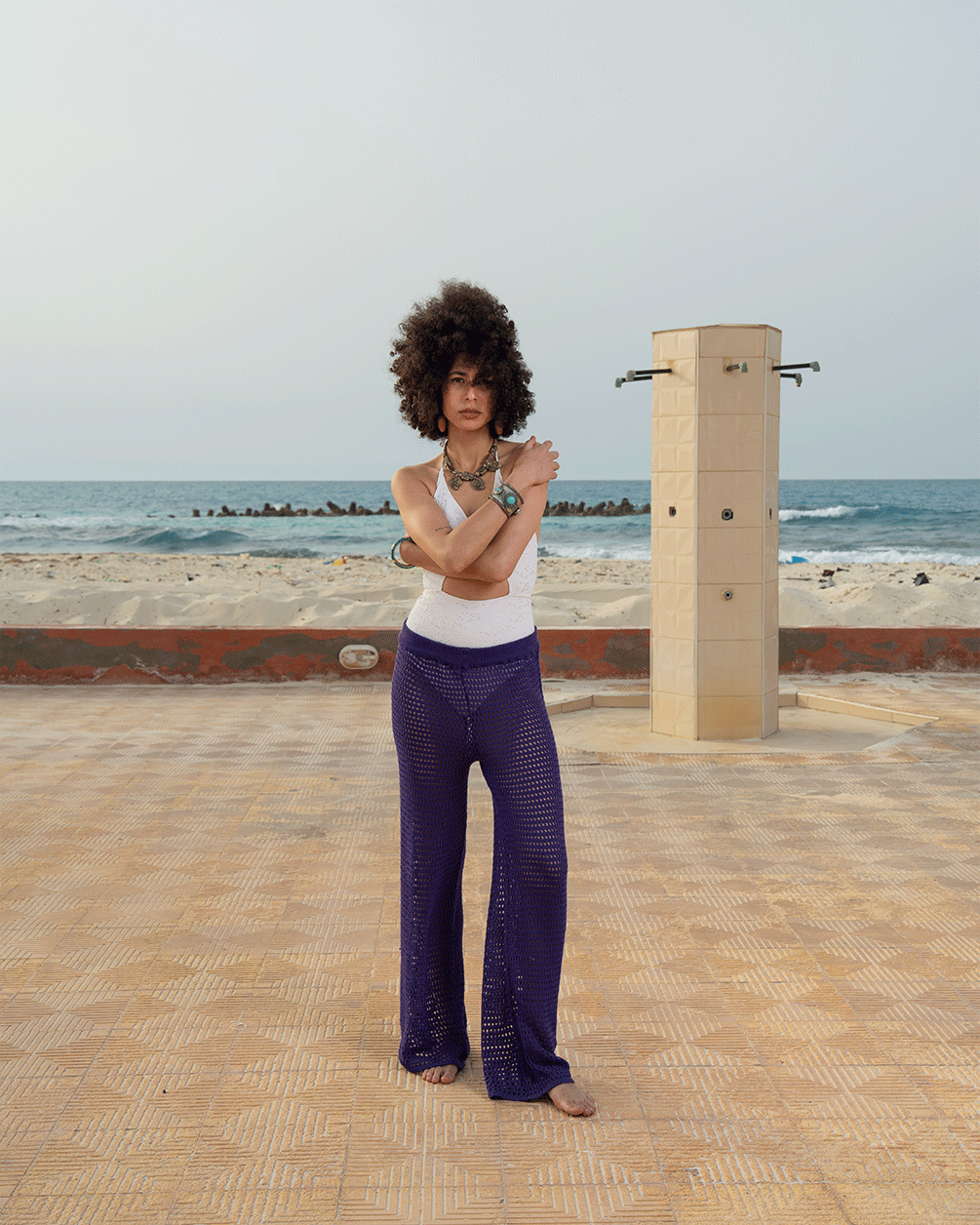 Violet crochet pants with a relaxed fit and breezy open-knit texture—easygoing and effortless.