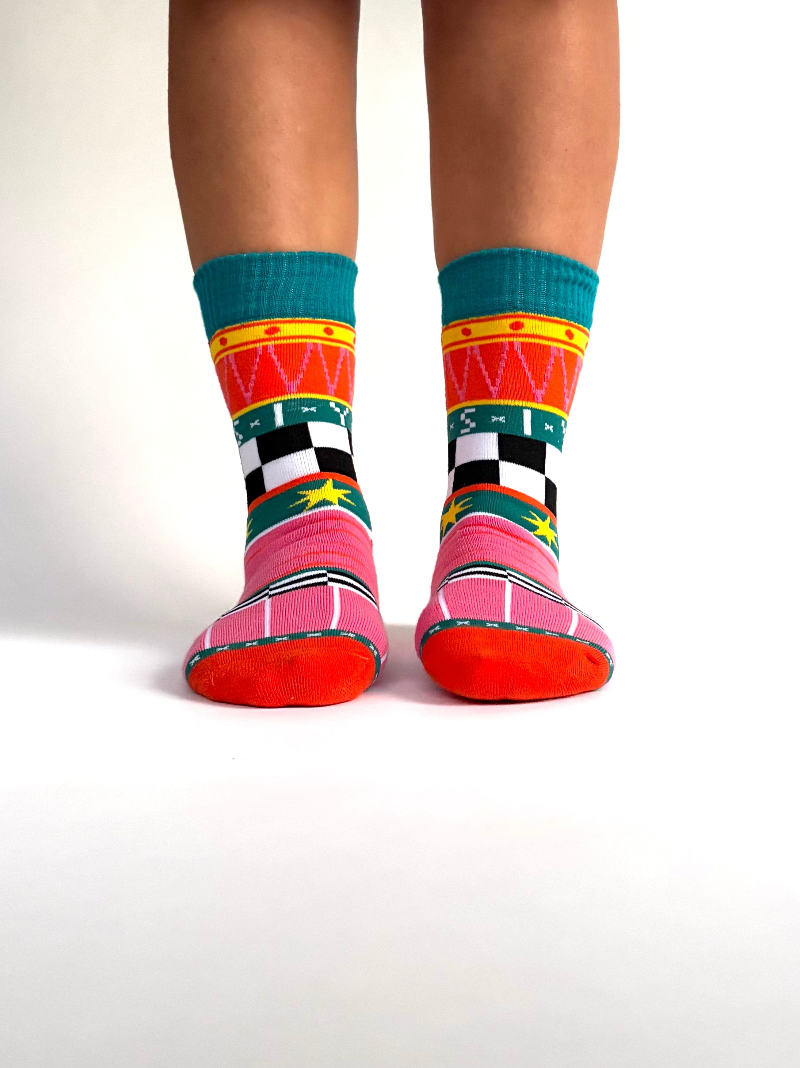 So many patterns it’s basically a funfair for your ankles. Busy, colorful designs packed all over the sock, giving full “my feet ran away and joined the circus” energy while you sit comfortably doing nothing.