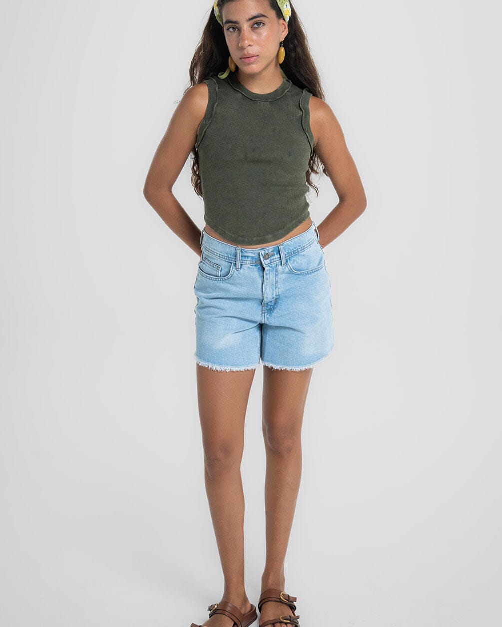 Ribbed sleeveless crop top in a washed dark olive shade. Features raw edges and a pointed hem for a cool, laid-back look.