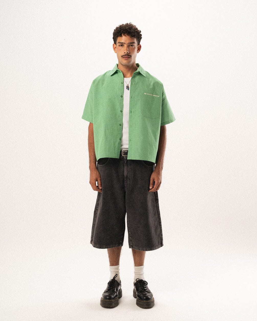 Boxy linen shirt in a green grid pattern, designed with a relaxed, structured fit. Lightweight and breathable, it features a straight silhouette with a slightly oversized cut for easy everyday wear.