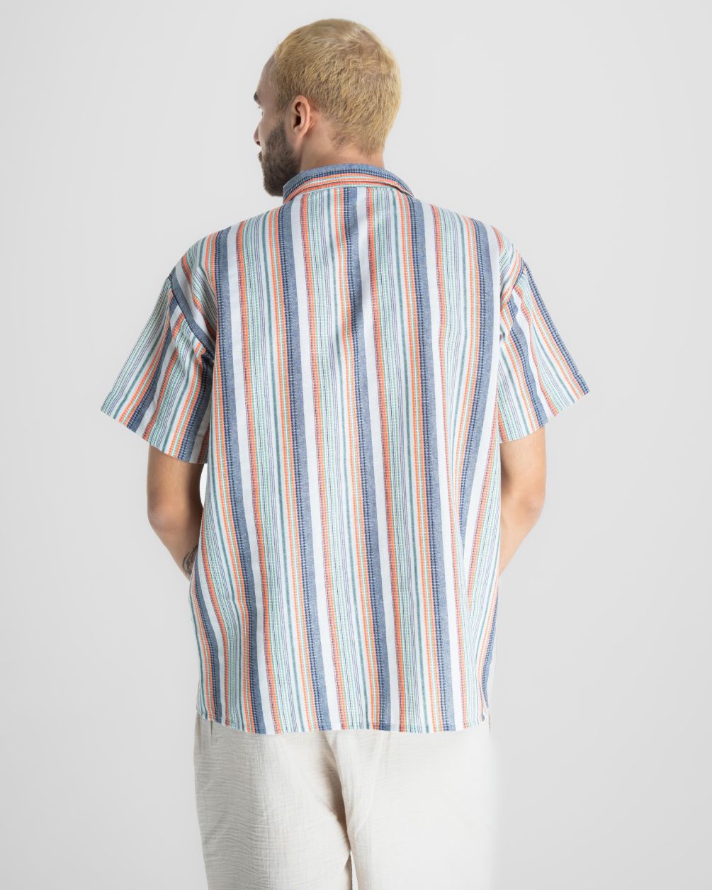 Short-sleeve button-up shirt with a relaxed fit, featuring colorful vertical stripes in a lightweight, breathable fabric! Perfect for casual, warm-weather wear.