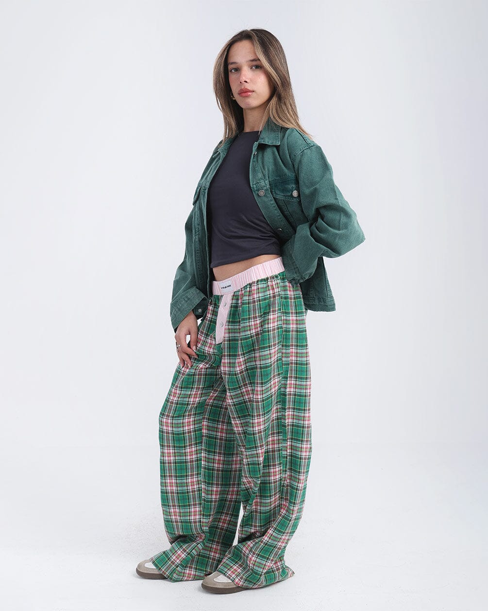 Comfy meets cool with these oversized plaid boxer pants. Featuring a vibrant mix of pink and green plaid, a relaxed fit, and a contrast elastic waistband, they’re perfect for lounging or making a bold streetwear statement. Style them up or keep it casual, your call!
