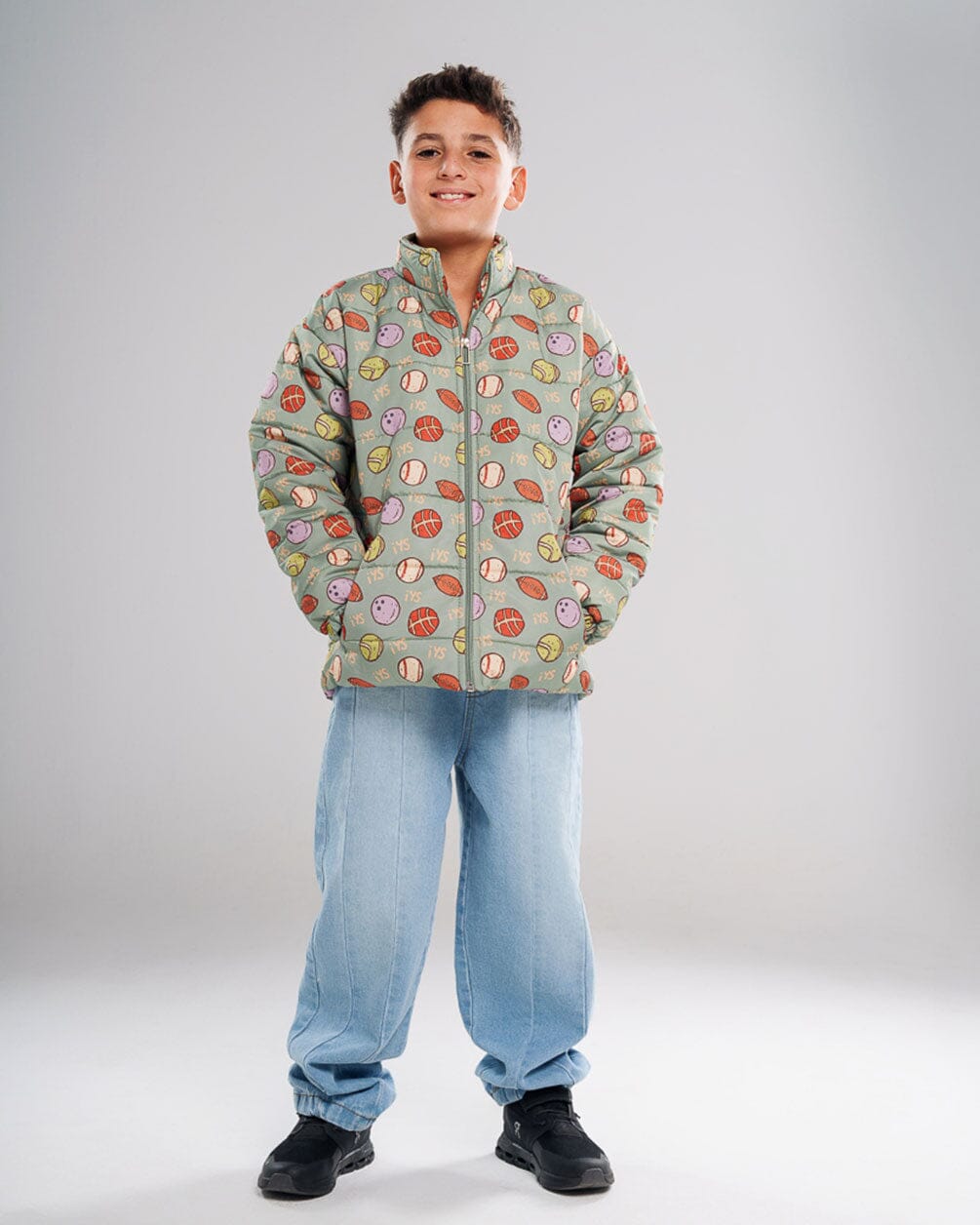A bold, all-over print puffer with a comfy oversized fit. Warm, lightweight, and made for kids who love staying cozy while standing out.